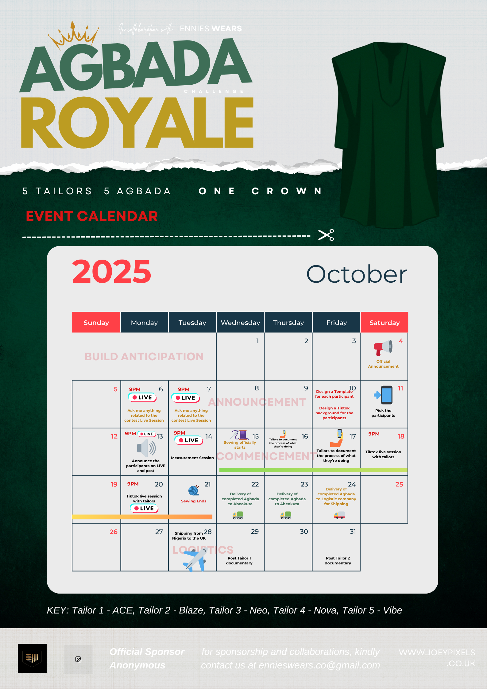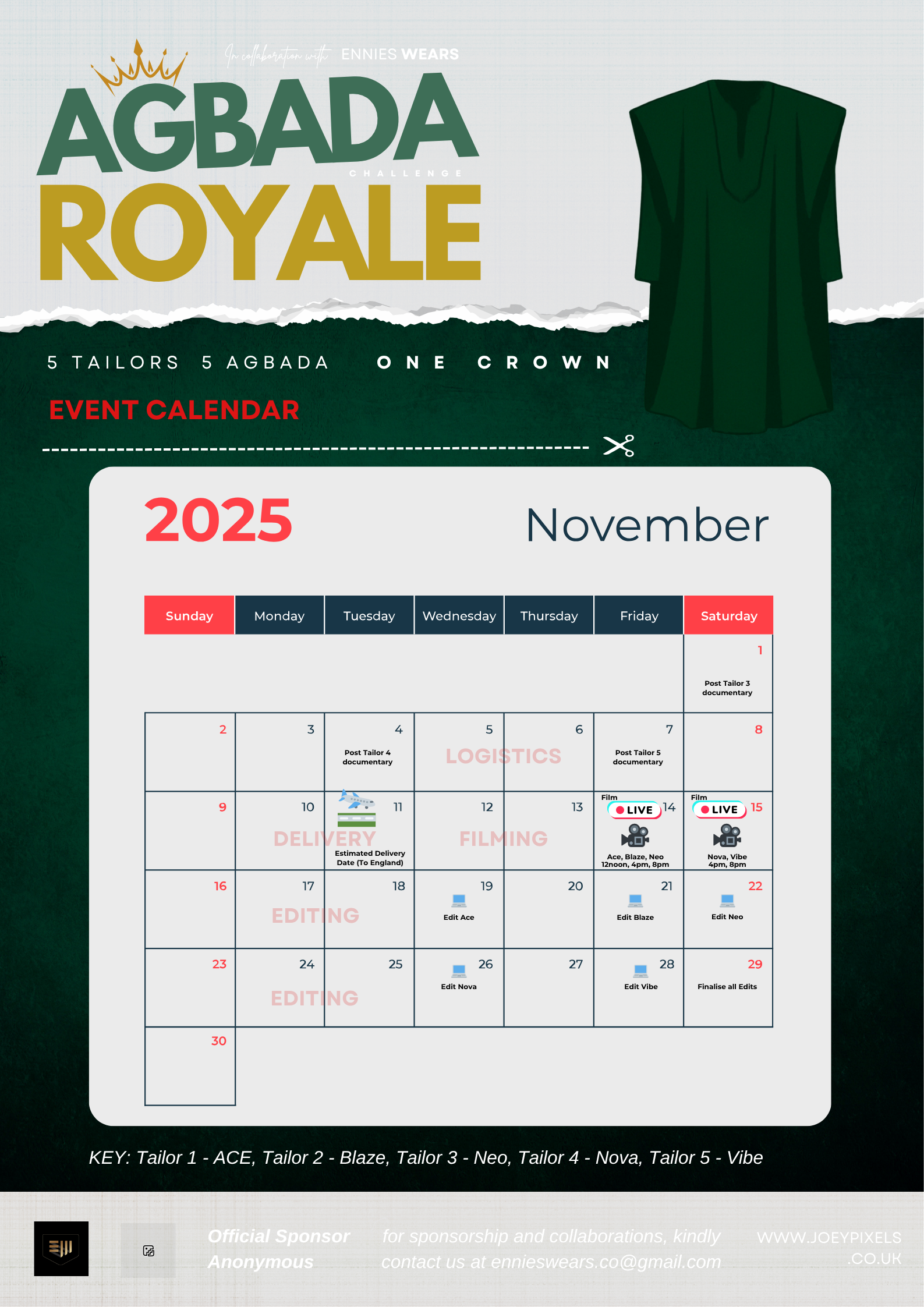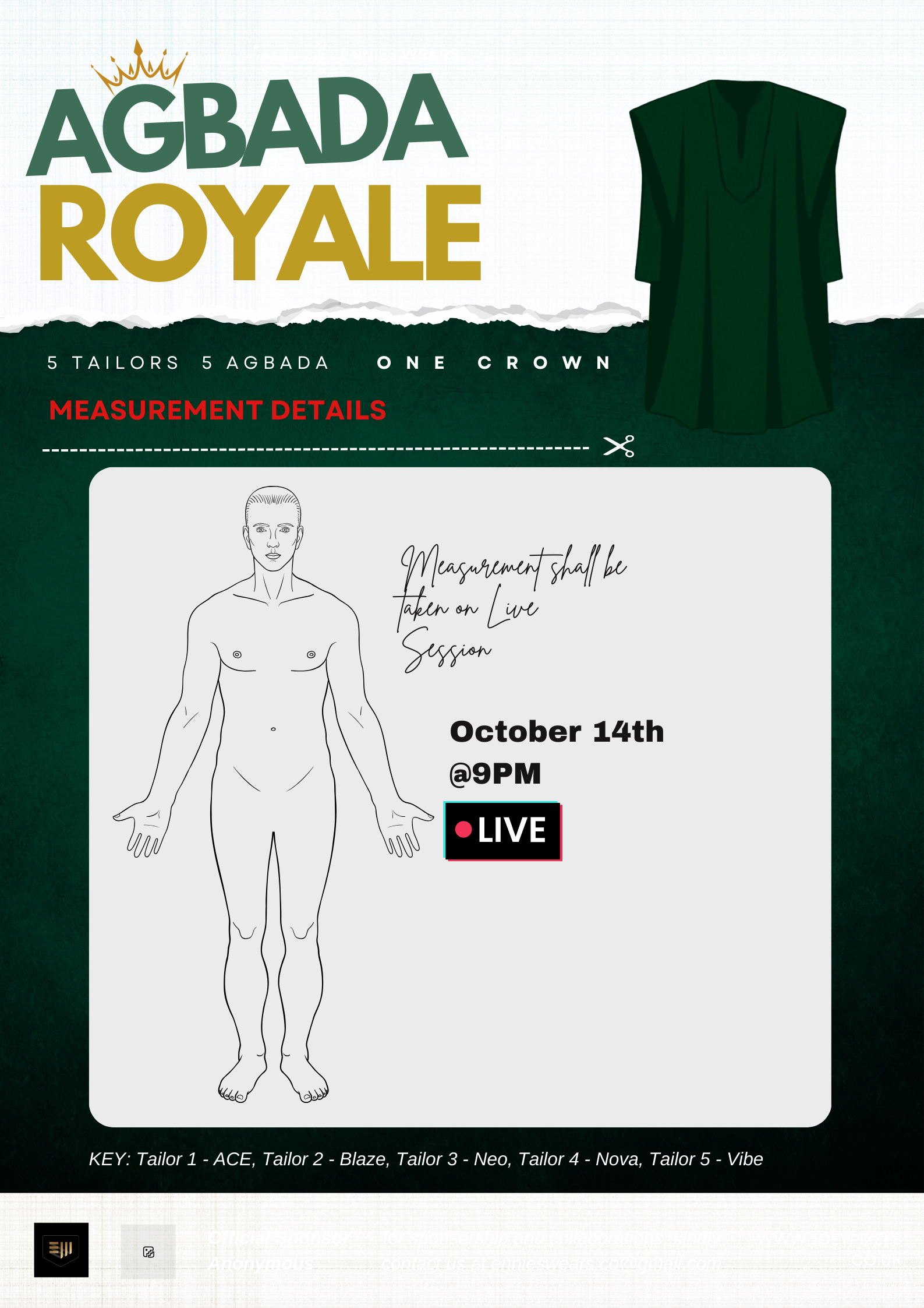 All 5 agbadas shall feature in different GRWM Video, one video shall be uploaded every day apart from Thursday and Sunday. i.e one video at 11PM Monday, another on Tuesday day, and so on.
